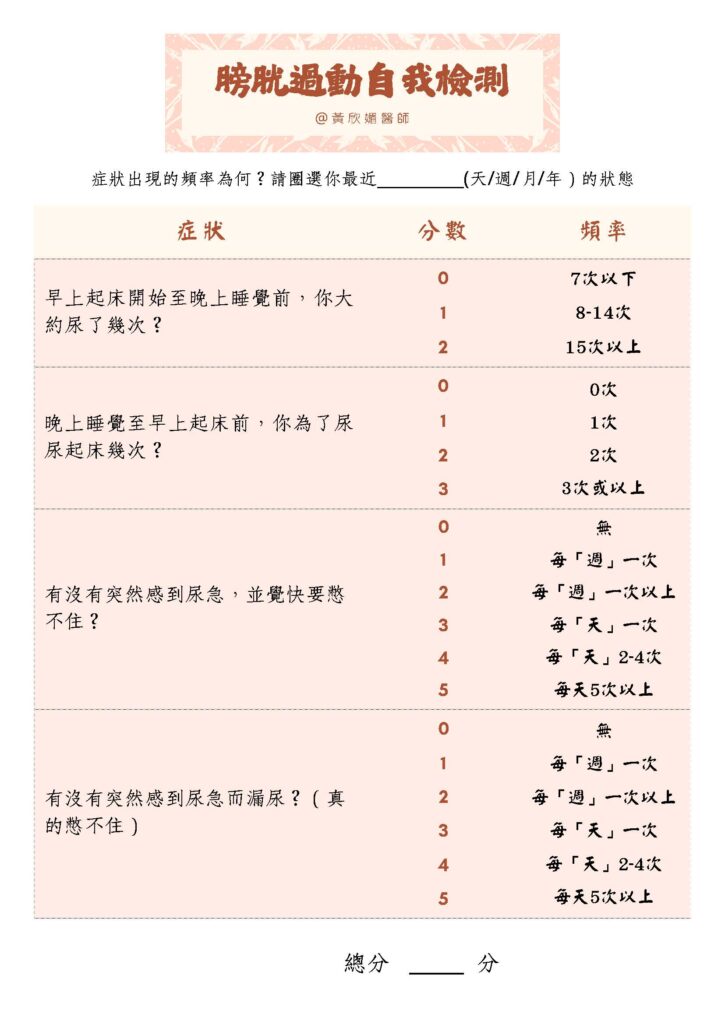 你該認識的膀胱過動症 Overactive bladder黃欣媚醫師2025-07-25一般泌尿 「急、急、急」 人有三急,膀胱過動最重要的症狀就是急。一種不趕快找到廁所就有可能要尿褲子的感覺。有些人可能還伴隨 頻尿:一天解尿超過8次 夜尿:睡著之後被尿意喚醒 急迫性尿失禁:實在憋不住,到廁所前就漏尿了 雖然不危害身體,但是對生活品質影響極大,常常擔心找不到廁所、不敢出遠門、甚至時時擔心身上是否帶著異味。 我有膀胱過動嗎? 膀胱過動自我檢測表:
